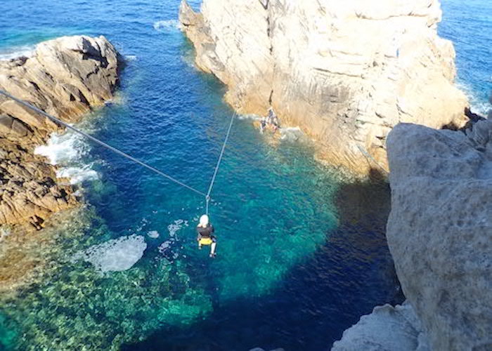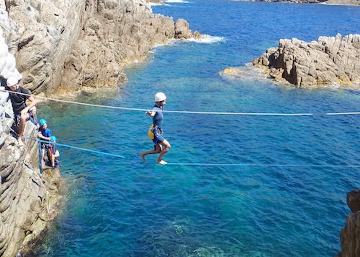 Du canyoning en mer, avec les mêmes sensations qu’en rivière. Vous allez pouvoir faire de la tyrolienne (60m), des sauts, de la slack-line (sangle tendue au-dessus du vide), du rappel et même un peu de snorkeling. Notre activité coasteering (canyoning marin) se déroule dans une calanque.